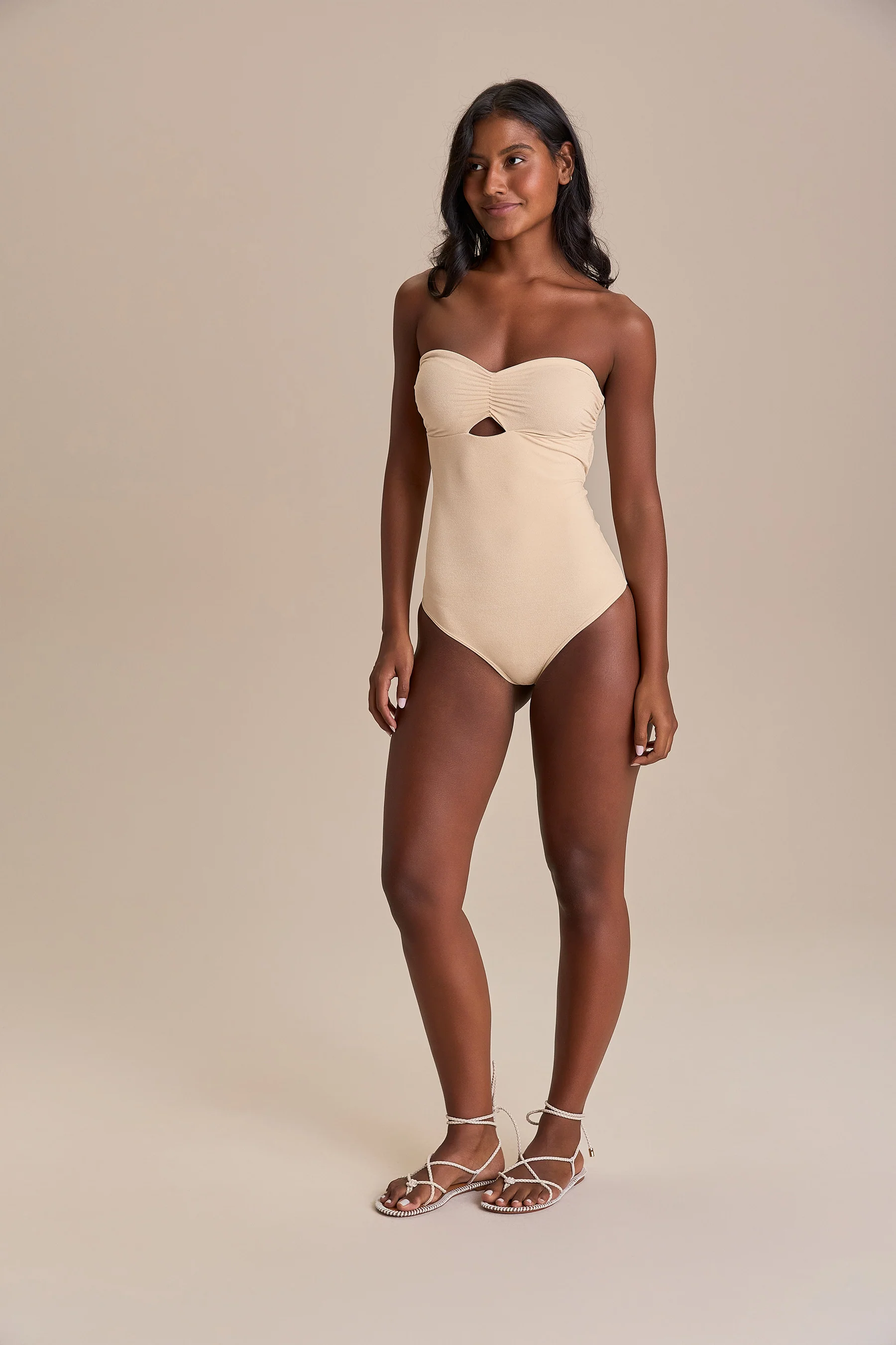 The Spell One-Piece features delicate ruching and a front cut-out that subtly reveals the skin with modern elegance.
