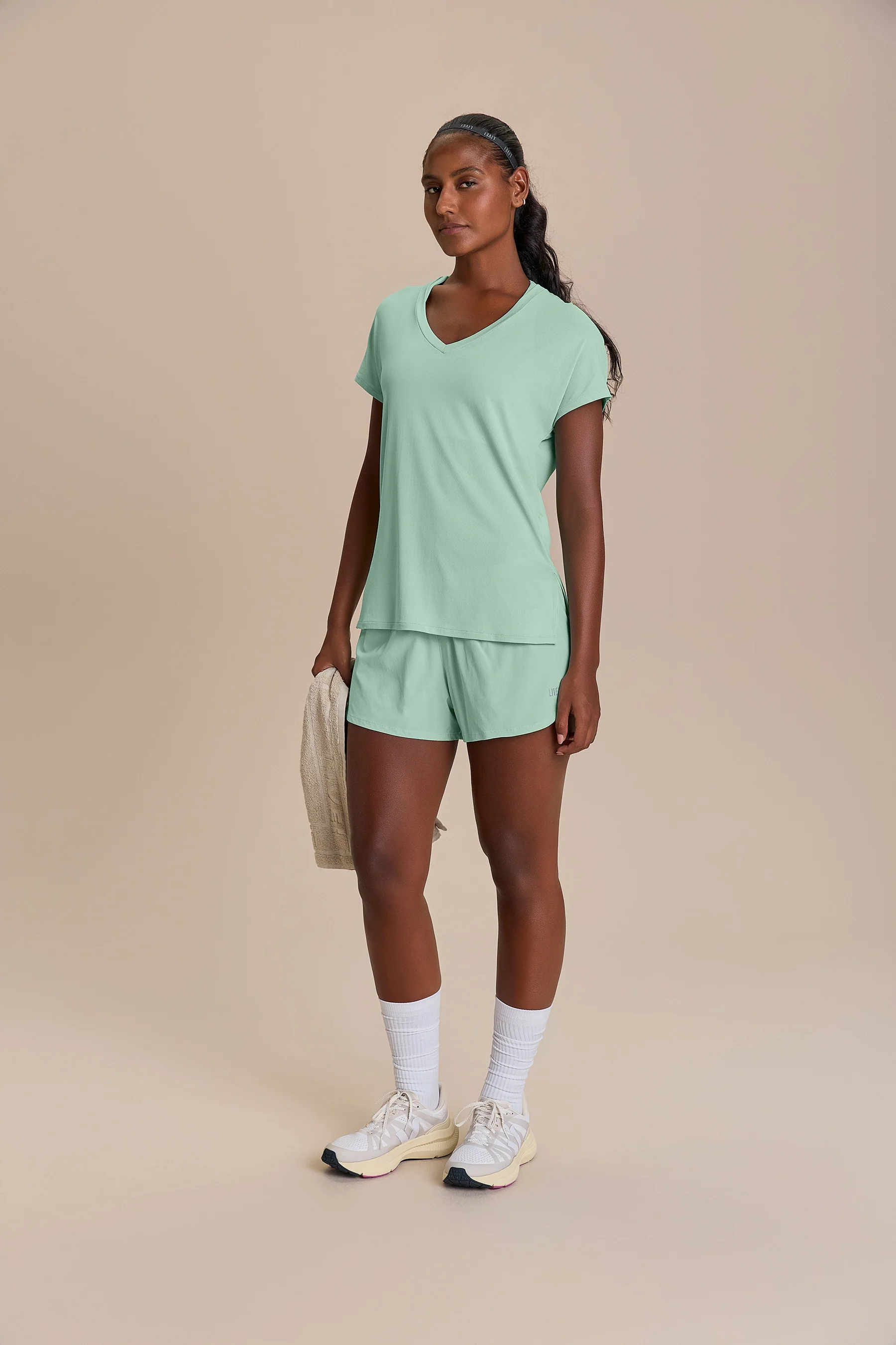 Lightweight training t-shirt designed for comfort and ease of movement during light to moderate workouts. Features a relaxed, body-skimming fit with a V-neckline that elongates the neckline and adds a flattering touch. Side slits enhance mobility and bring subtle detail to the silhouette. Crafted from ultra-lightweight, breathable fabric with Quick Dry technology to support moisture absorption, while Easy Care properties simplify everyday maintenance. Finished with exclusive Signature LIVE! branding for an authentic look.
